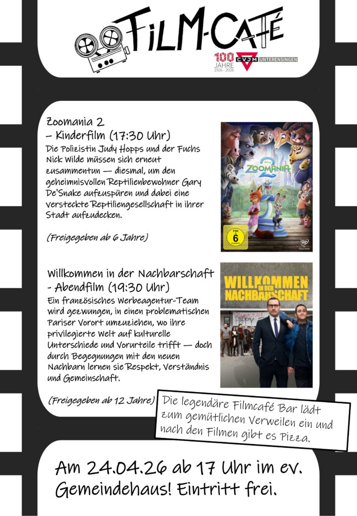 In unserem Jubiläumsjahr lassen wir vergessene CVJM-Formate wieder aufleben. Und so auch das Filmcafé. Am 24.04.2026 zeigen wir zwei Filme. Die erste Filmvorführung beginnt um 17.30 Uhr und ist für das jüngere Publikum gedacht. Die zweite Filmvorführung beginnt um 19.30 Uhr und richtet sich an Jugendliche ab zwölf Jahren und Erwachsene.